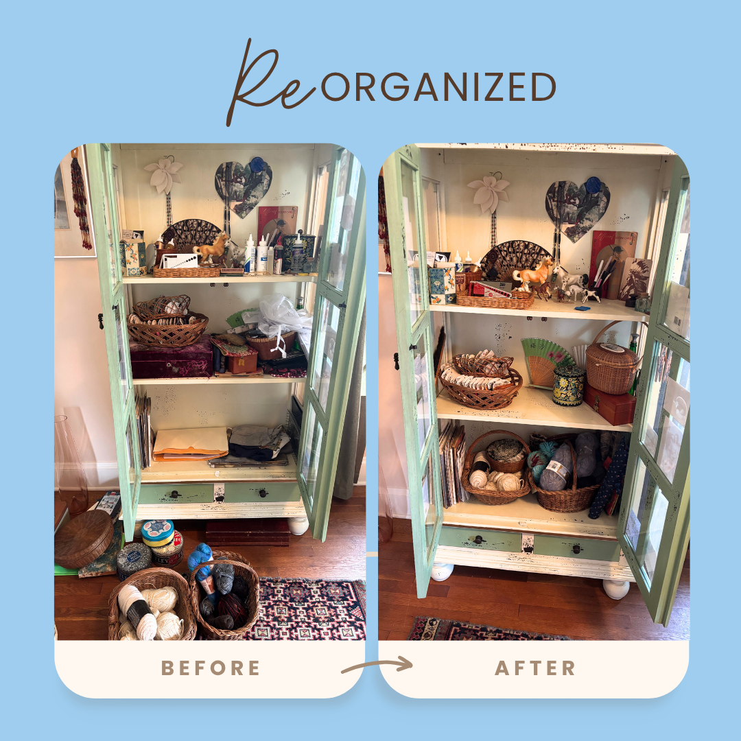 My favorite room in the house to organize is the office/craft room. Just this month, I realized I had been holding on to too much stuff, including old paperwork, extra yarn, and fabric that I would never use. When I set up the room, I had assigned drawers and baskets for specific items, but I realized some spots weren’t working, especially in the cabinet, and I was trying to fit too many different things on one shelf. I pulled everything out, reorganized, and found two bags worth of things I could donate, which gave me more room to actually see what I have and use it! It was a great reminder that even after a room is organized, it doesn’t mean it never needs to be reorganized again.